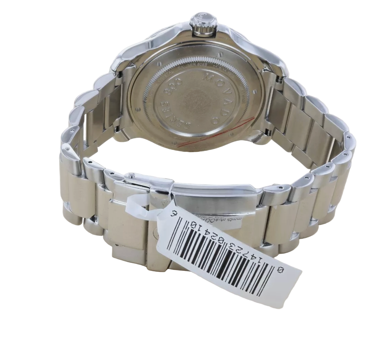 Stainless steel case with a stainless steel bracelet. Uni-directional rotating stainless steel bezel with an inlaid blue and silver ring. Blue dial with luminous silver-tone hands and cabochon hour markers. Minute markers around the outer rim. The Movado Dot appears at the 12 o'clock position. Dial Type: Analog. Date display at the 3 o'clock position. Movado calibre 608B automatic movement with a 42-hour power reserve. Scratch resistant sapphire crystal. Screw down crown. Solid case back. Round case shape. Case size: 42 mm. Fold over clasp. Water resistant at 200 meters / 660 feet. Functions: date, hour, minute, second. Series 800 Series. Dress watch style. Watch label: Swiss Made.